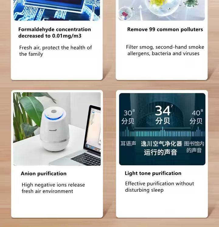 - Bedroom: T02PRO air purifier creates a fresh sleeping environment in the bedroom and improves air quality through negative ion mode and HEPA filter.